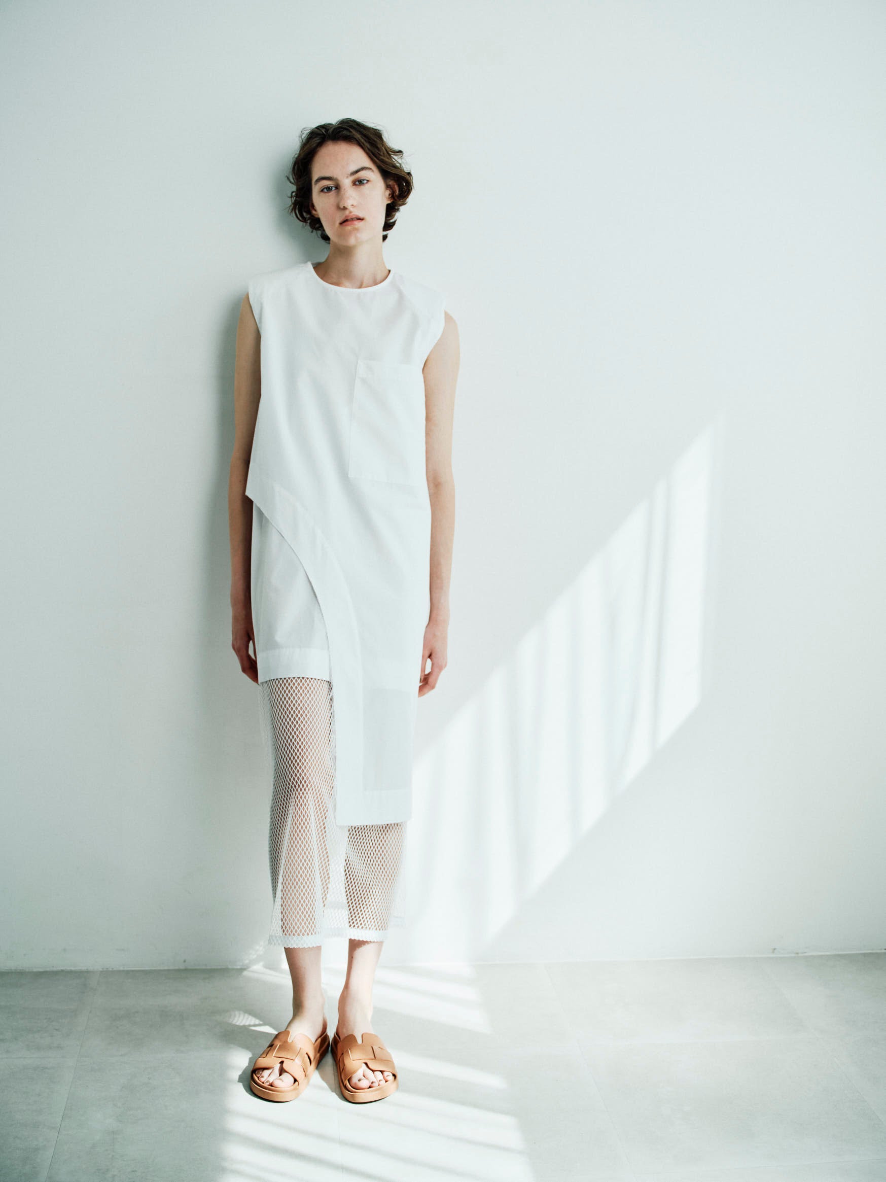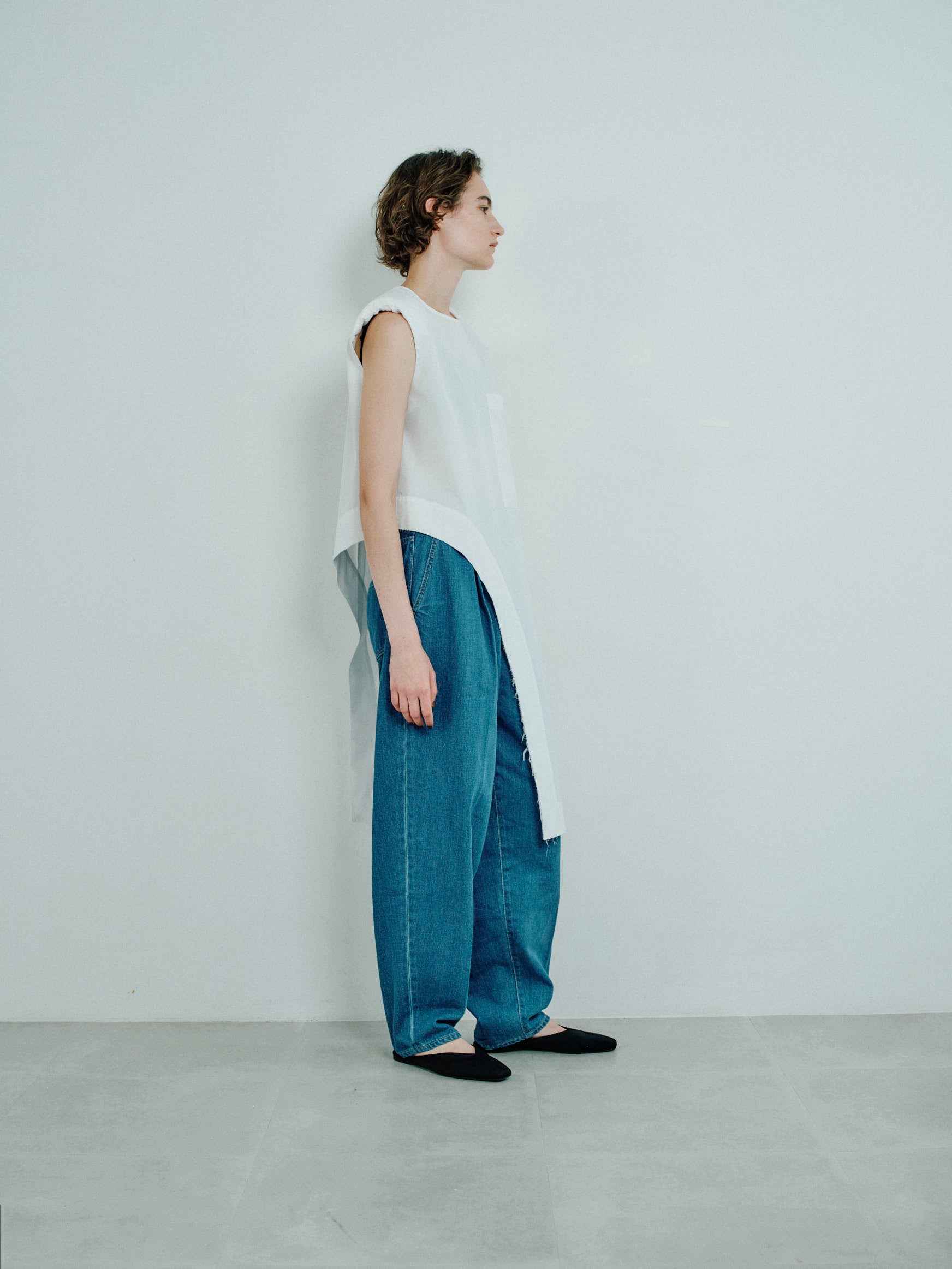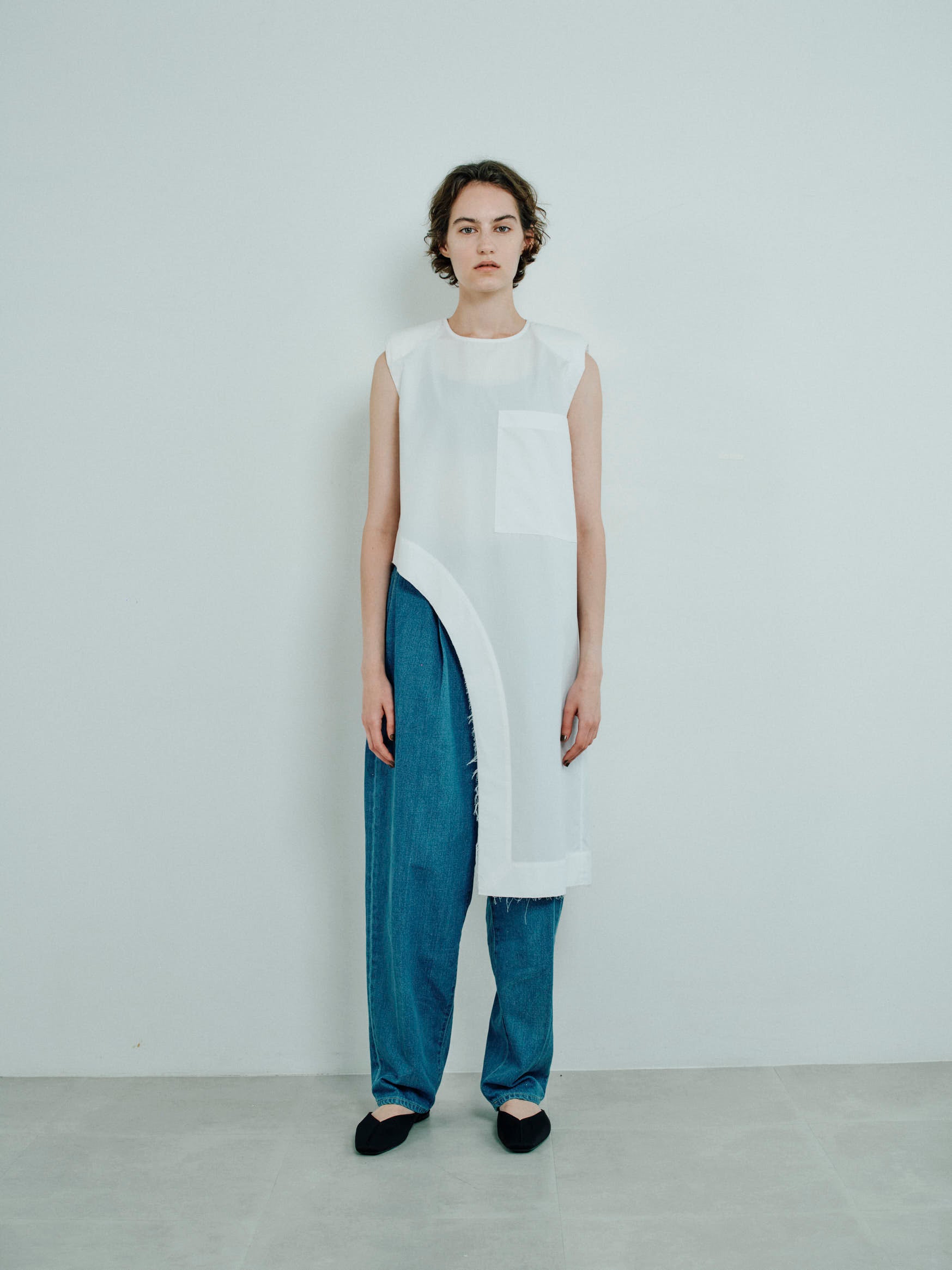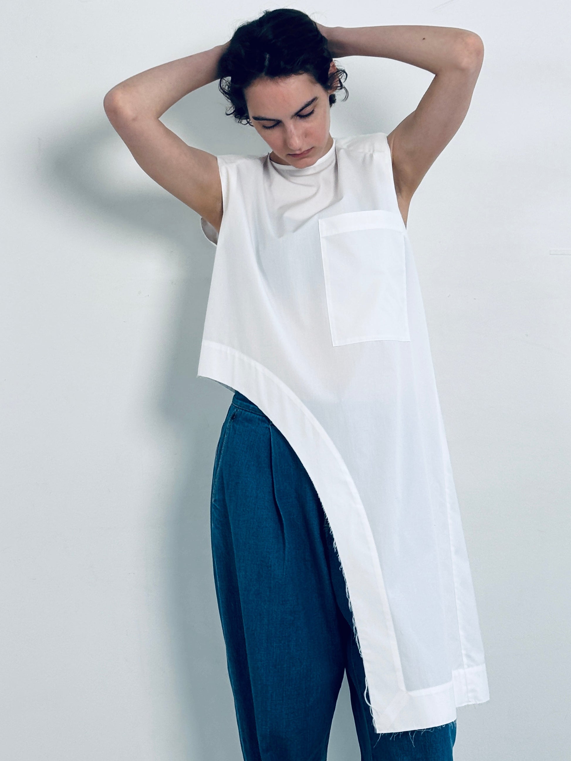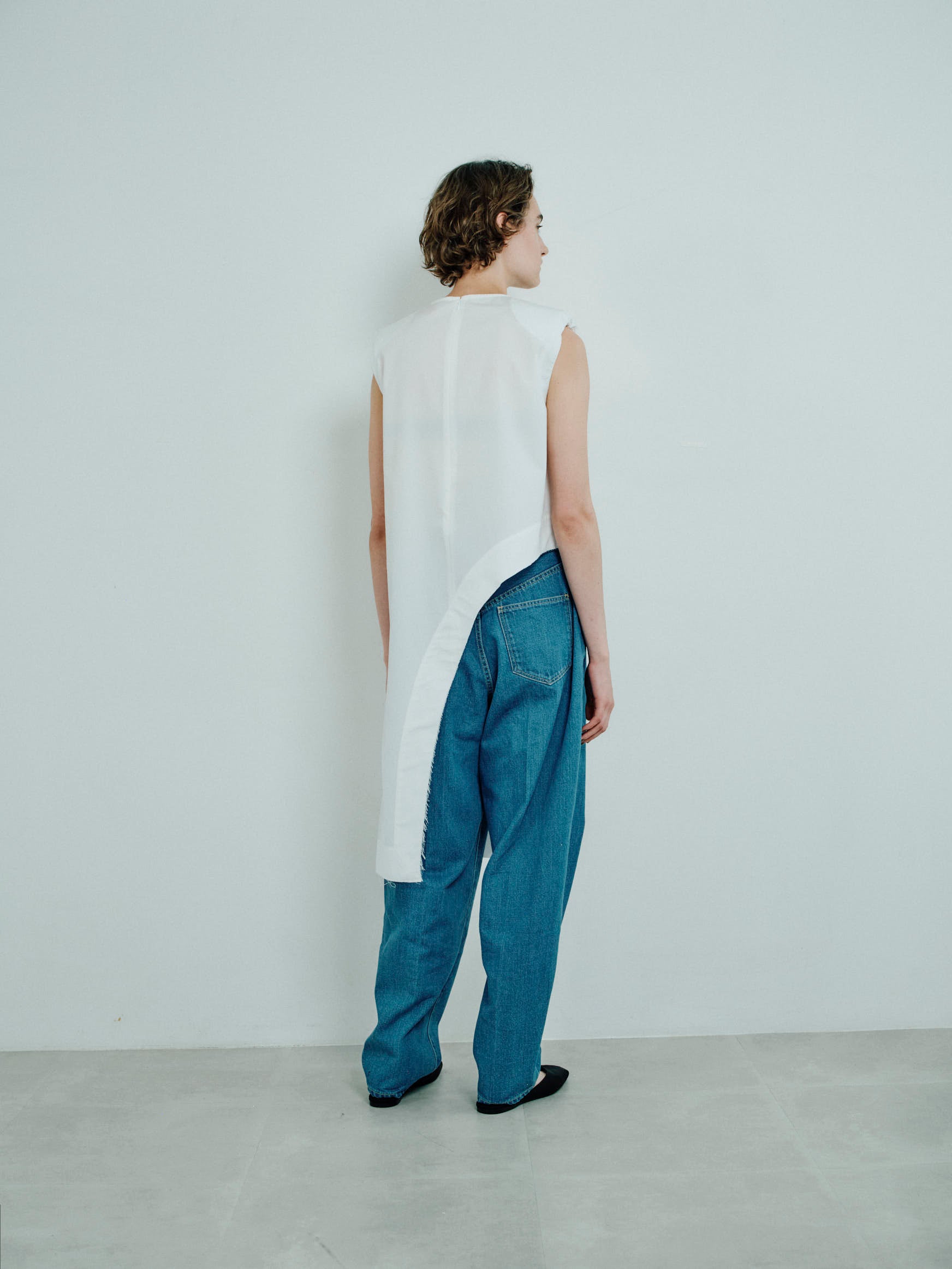 着丈が大胆なアシンメトリーのパワーショルダーシャツ